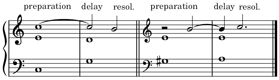 A Delay is a technique of realization which always implies the sequence of two chords (*). This occurs when a real note from the first chord is prolonged into the next chord, momentarily becoming an accidental note by taking the place of a real chord tone, before resolving to the note it replaced. Thus, for a note of a chord to be delayed, its necessary for the note which causes the delay must be prepared.