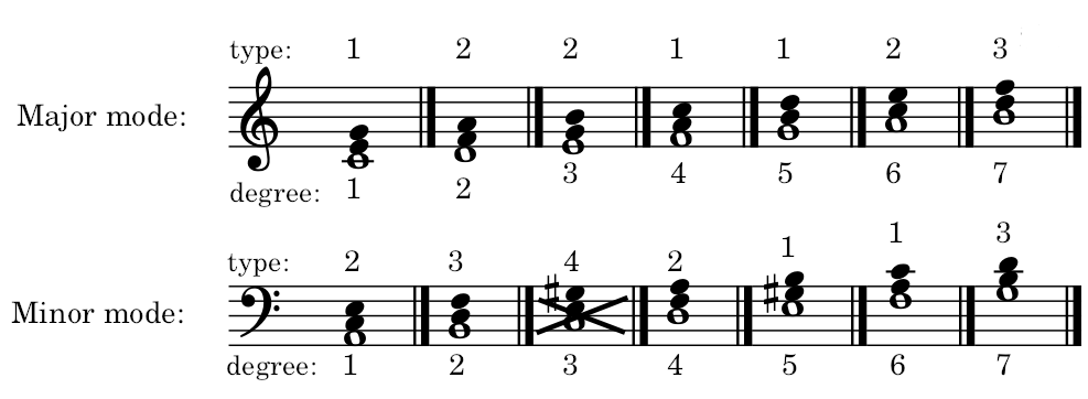 By forming a triad on each degree of the two modes, and by classifying each of these chords according to the nature of their intervals that compose them, the various species are the following:
