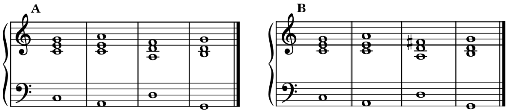 Its important to recognize the role played by the third chord in each of the previous examples. In Ex. A, this chord is the supertonic (2nd) of C major. In Ex. B, it can only be the dominant (5th) of G major. As a result, in Ex. B, the progression from A to D isn’t a progression of upper fourths like in Ex. A, from the 6th to the 2nd degree in C, but a progression of the submediant (6th) of C to the dominant (5th) of G.