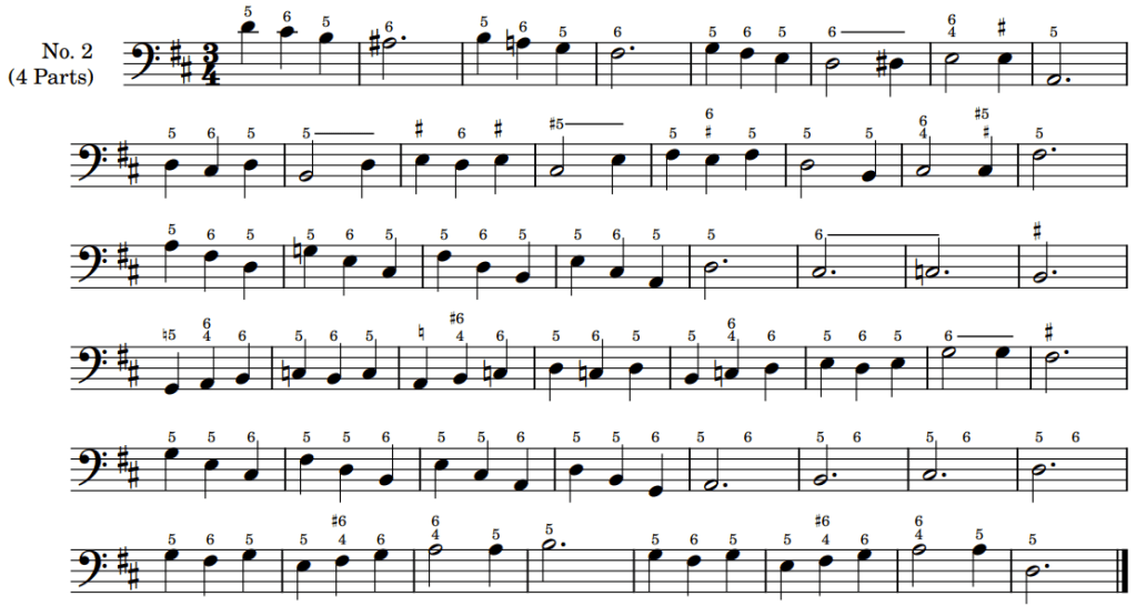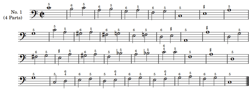 Any second inversion, in order to be used in a model, must meet the conditions of 7.3. Thus degrees which, aside from harmonic marches, don’t allow the second inversion, can be employed without inconvenience if they result from transpositions only in one key. The following Bass (No. 1) serves an example.