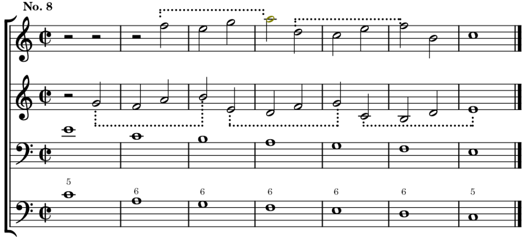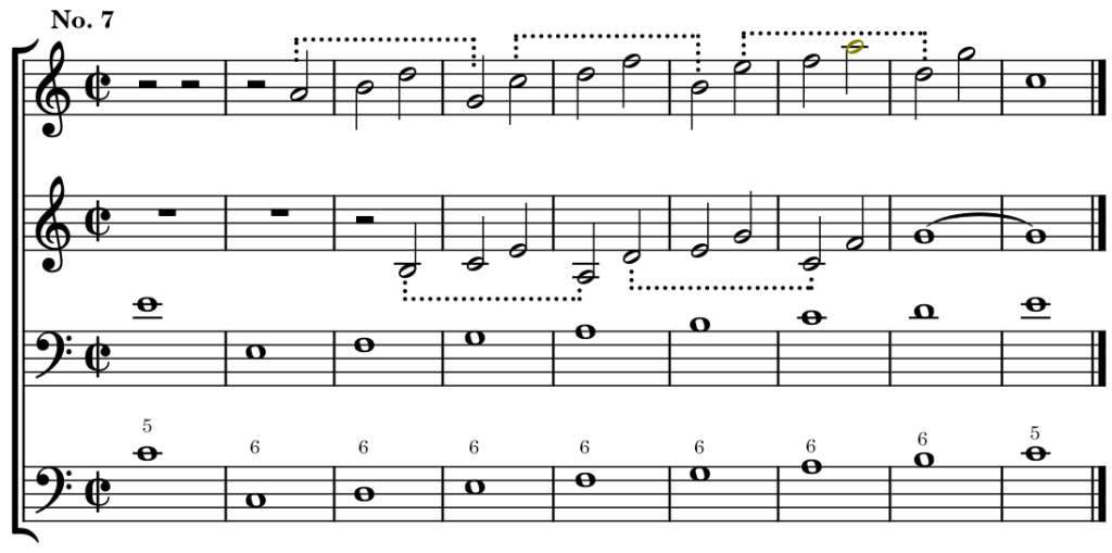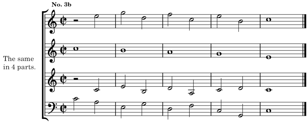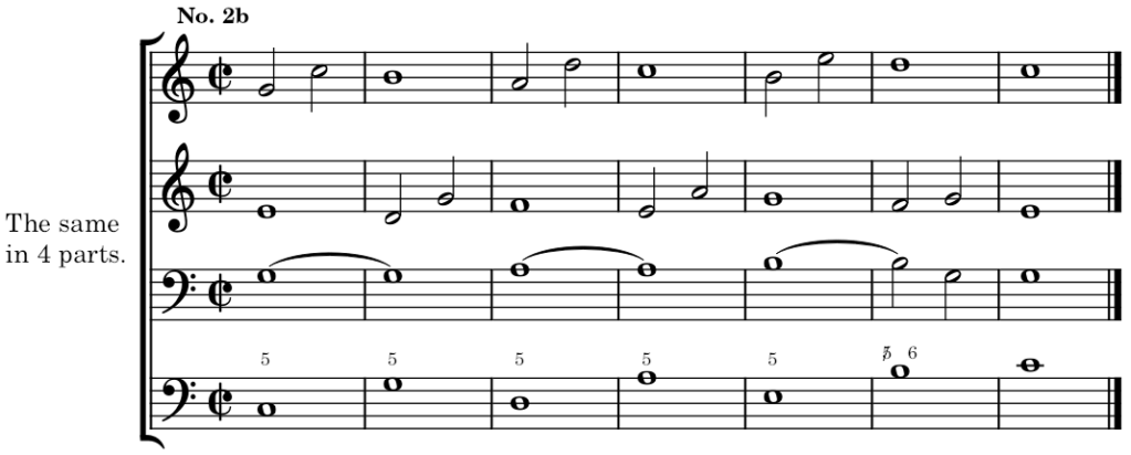 The sequence of sixths (7.1) either ascending or descending can only be realized in four parts by using imitations, which converts them into harmonic marches. The following examples offer the simplest realization of these kinds of marches, which become more interesting by adding suspensions and melodic notes (discussed in the parts 3 & 4), where the same marches are reproduced with various realizations.