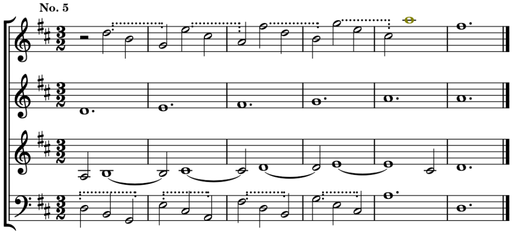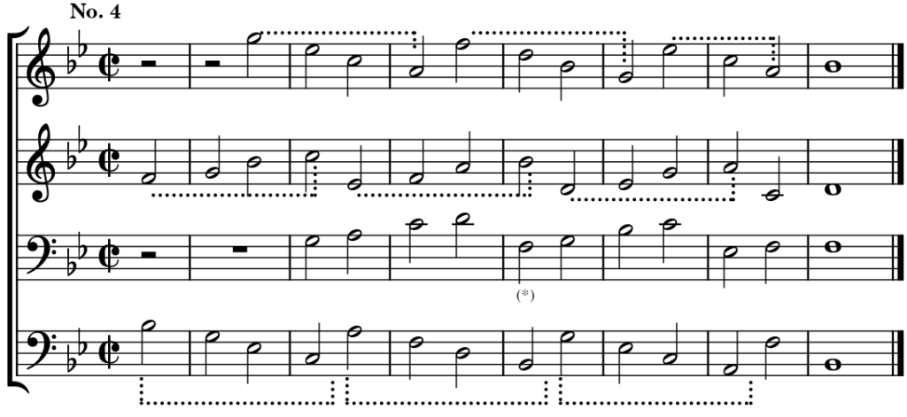 From the previous examples, we see each part in isolation is a regular melodic progression, a consequence of a melodic design or group transposed successively and symmetrically. A melodic progression, in any part, must be treated as a harmonic march. However, depending on the composer’s intention in a fantaisie, a predominant part may have a melodic progression without the regular march of the other parts and without each melodic transposition of the other parts in the same harmony. Thus, there’s no harmonic march.