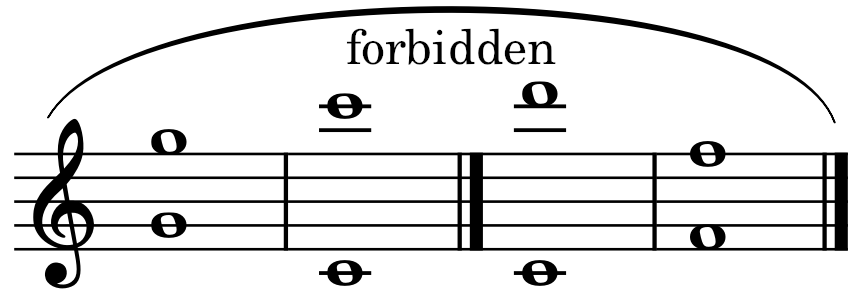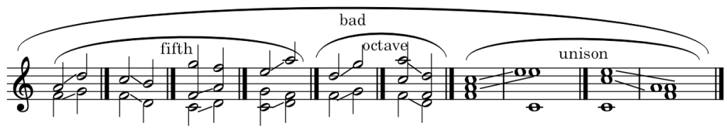 Rule 5: Parallel fifths and parallel octaves, which are two consecutive perfect fifths and two consecutive octaves between the same parts, by similar and contrary motion are forbidden. Since this applies to the octave, it also applies to the unison. Coming from a unison is also forbidden.