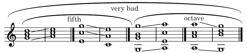 Remark: There’s a distinct difference between parallel fifths and parallel octaves. In general, the parallel fifths are harsh and incoherent. The parallel octaves are poor and hollow. Therefore, the effect of parallel octaves is worse than parallel fifths.