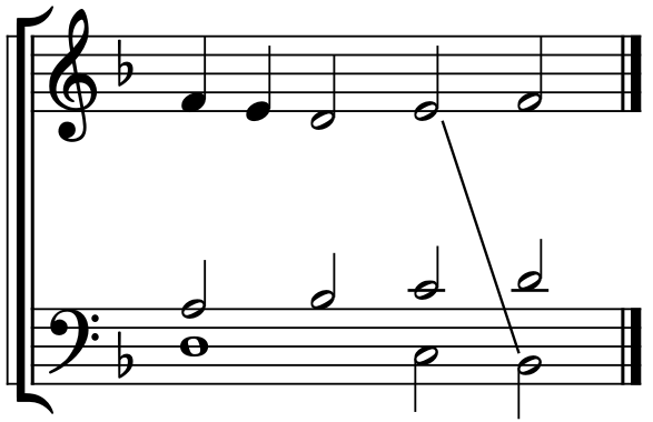 This progression in certain positions often produces harsh effects, attributed by the old contrapuntists, to the indirect relation of the B to the F (or of any notes an interval of an augmented fourth apart). In counterpoint, this is known as the False Relation of the Tritone.