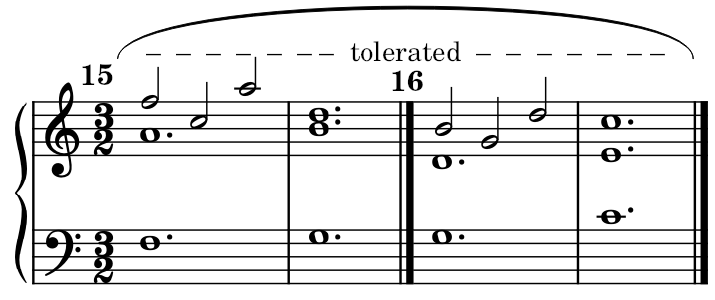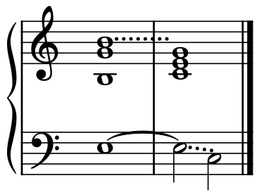 Delayed fifths or delayed octaves occur when one of the two chords in a realization undergo a position change resulting in a fifth or an octave between the extreme parts. Aside from this case, generally, modifying the second chord does not result in any inconvenience in realization. However, some authors consider delayed fifths and octaves as bad. Examples: