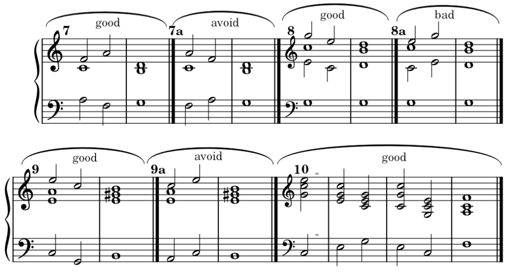 1. When two parts end in a perfect fifth or an octave simultaneously change position, either by contrary (Ex. 7 and 7a) or similar (Ex. 8, 8a, 9, and 9a) motion, the last position before the chord change is the only position which affects the realization of the next chord, regardless of the previous positions (Ex. 10.) Examples: