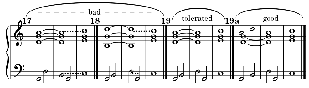 However, cases where the last position is identical to the first (Ex. 17, 18, and 19) are excepted from the previous rule. In this case, the last 2 positions affect the realization of the next chord. But realizations similar to Ex. 19a, 3, and 4 are the best in most cases.