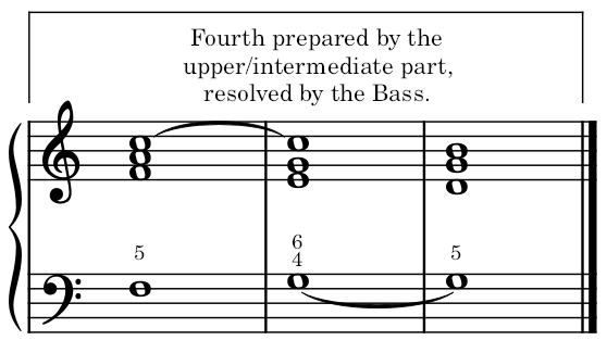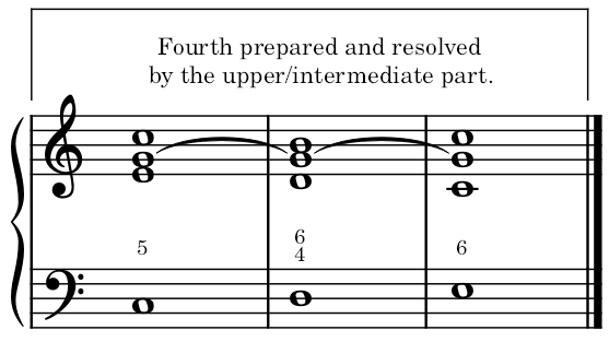 When a second inversion produces a perfect fourth between the Bass note and one of the upper parts, this fourth must be prepared by an oblique motion. Example:
