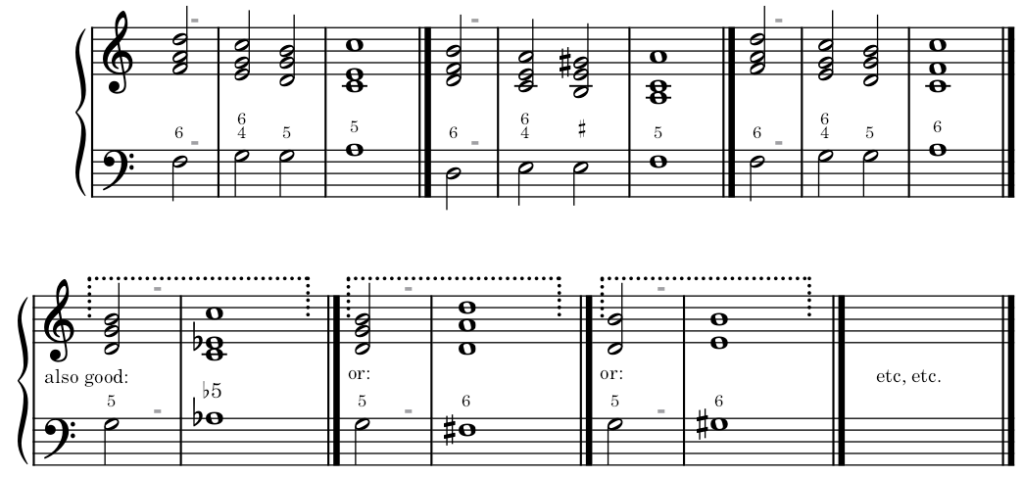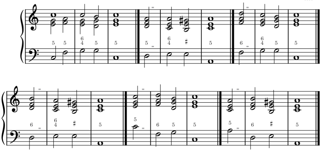 2. Imperfect Cadence – ends a phrase/piece with the dominant to the tonic chord, but either chord is inverted (tonic (Ex. 1) or dominant (Ex. 2)). The perfect cadence is weakened, resulting in the imperfect cadence. This cadence does not end a final cadence, and requires at least another phrase to complement it. Examples: