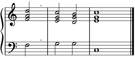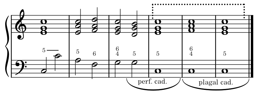 4. Plagal Cadence – often employed at the end of a piece after a perfect cadence. End with the subdominant (4th, either in root position or inverted) to the tonic which ends the piece. In this case, the plagal cadence forms a sort of Coda added to the piece. But the plagal cadence can occur without being preceded by the perfect cadence, and can conclude any phrase except the final phrase. Examples: