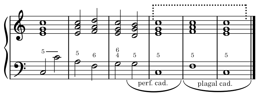 1. Perfect Cadence – ends a phrase/piece with the dominant to the tonic chord, both in root position. Listed below are the common perfect cadences: