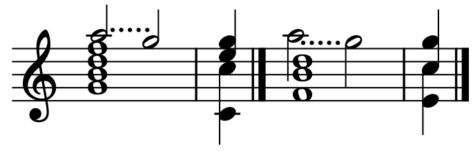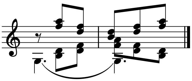The suppression of the root is very frequent in the major ninth chord. Its then commonly called the seventh chord of the leading tone, an improper denomination, as this chord shouldn’t be confused with that of the 7th degree (14.2), whose root is the leading tone, doesn’t have a constrained march, whose dissonance requires preparation, suitable for all inversions, and is only used in harmonic marches (14.3).