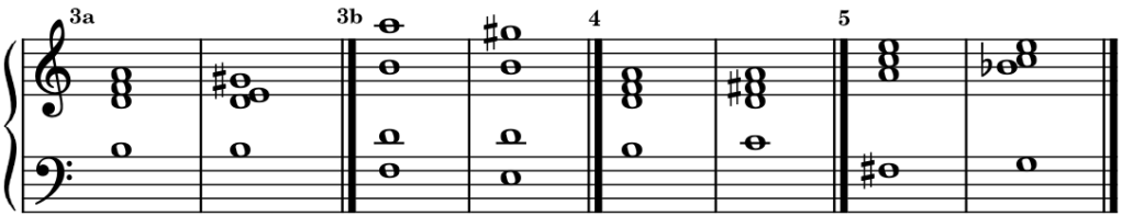 However, the reflections of Ch. 14.2 can be applied to the major ninth chord without the root. This gives rise to the exceptional resolution Ex. 3, and the exception Ex.7.