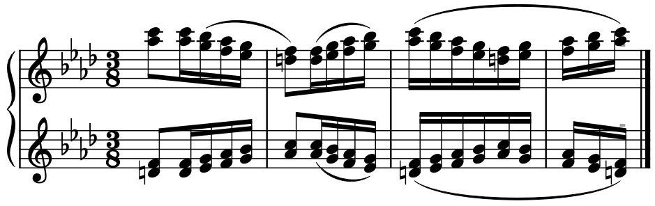 The major ninth chord in the root position is the peak natural and complete chord because its produced by the resonance of a sound body (see Introduction). This chord, while not consonant, is extremely harmonious. But its chord tones have a very limited motion because of the three notes with a constrained resolution. Moreover, the chord is subject to the rules listed above. These rules make this chord difficult to handle, and cases where it can be used advantageous are rather rare. It doesn’t lend itself to short durations, and its primary charm consists in a sufficiently long duration for its resonance to penetrate the musical feeling.