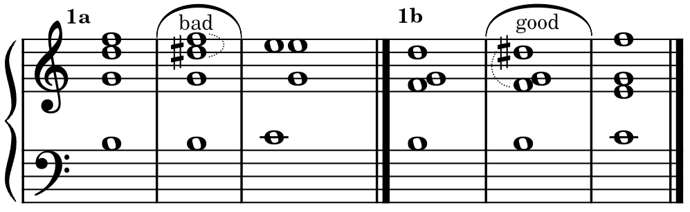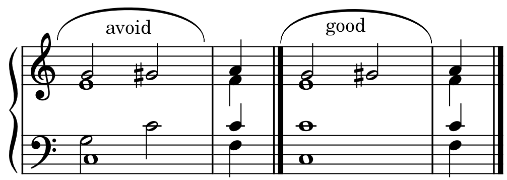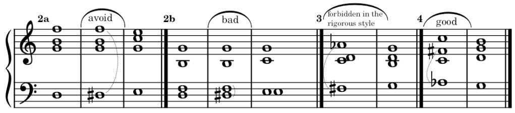 Note: The rule needs some restrictions in the free style, as will be seen in 17.3. In this case the inversions which result in the diminished third must be arrange to present the interval of the tenth (Ex. 2a) instead of the third (Ex. 2b).