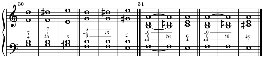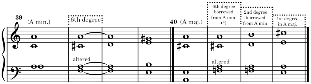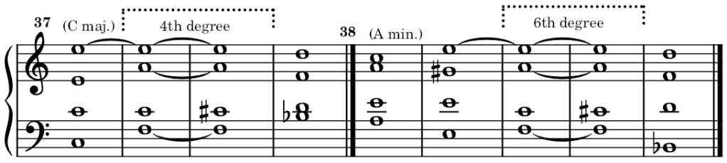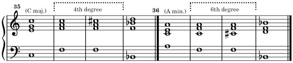 The chords of the 4th of the major mode and the 6th of the minor mode may also get an augmented fifth. The examples are very rare. The natural resolution of these altered chords leads to a modulation. In other words, the alteration is enough to convey them as either a tonic or dominant chord of another key. Examples: