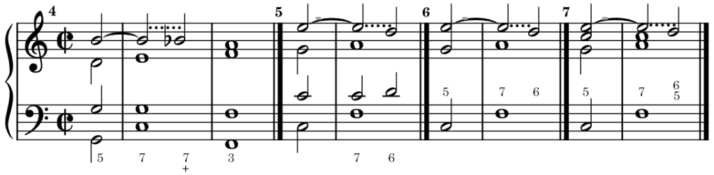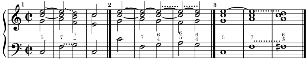 The major seventh chord is the most dissonant of all seventh chords, so the preparation of its dissonance is a strict requirement. It’s placed on the 1st and 4th degree of the major mode, and on the 6th degree of the minor mode (see Ch. 14). This chord is notated the same as the chords of the previous articles.