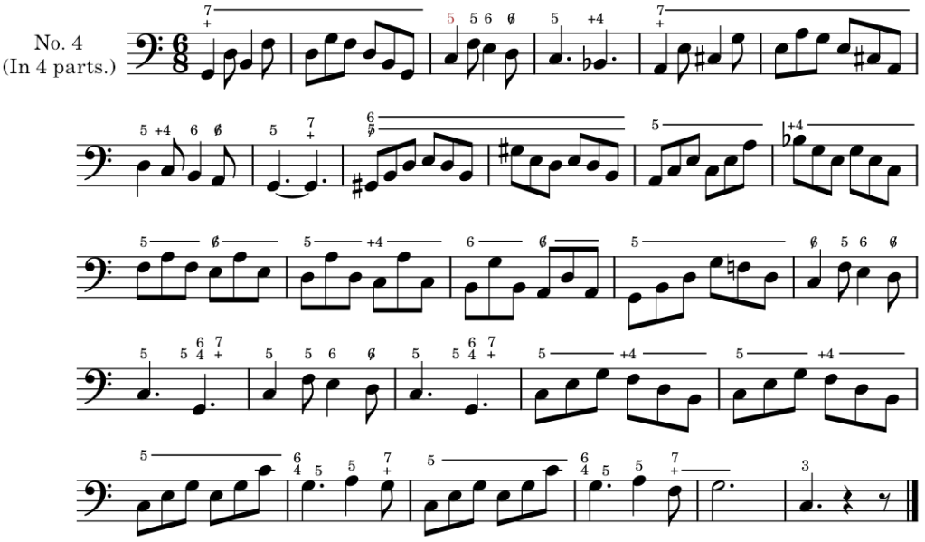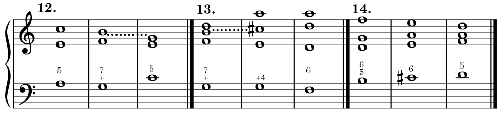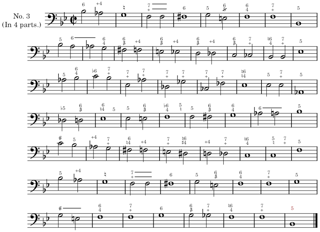 The little cross, +, serves exclusively to indicate the leading tone in all dominant dissonant chords. In the root position, the little cross is placed above the root and represents the third, as would any isolated accidental, as if the chord was figured 7 +3. The second inversion, in many schools, is +6 instead of six bar.