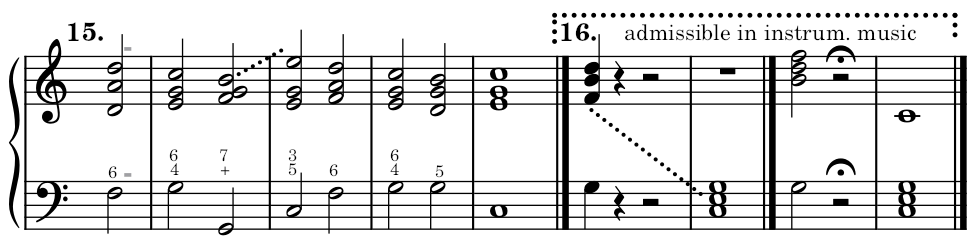Observation: Many modern authors have often ignored preparing and solving the fourth in the second inversion of the dominant seventh chord. For students, this exception is only to be used when resolving the first chord, similar to the example in 2a. marked with (*).