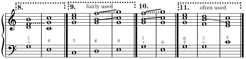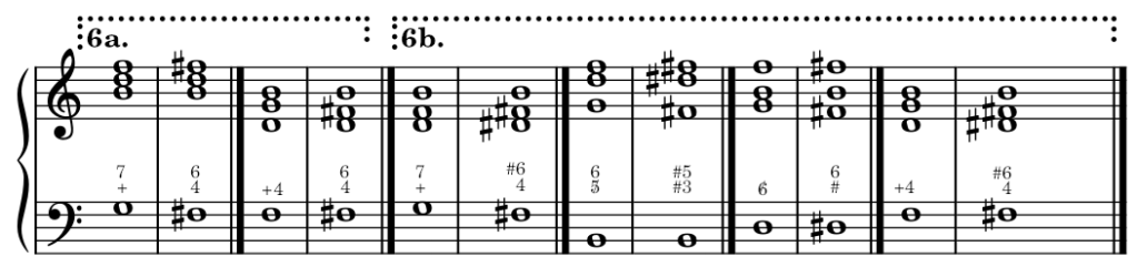 Note: The figuration above is generally adopted for the seventh dominant chord as it does not require any indication of accidentals that modulations require, in any circumstance and invention.