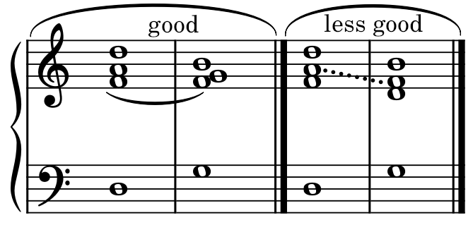 The dominant chord, with or without the seventh, sometimes allows the suppression of the third. This suppression is done according to melodic convenience or an insufficient number of parts. Example: