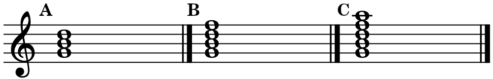 The basic structure of all chords consists of a set of three, four, or five different sounds all belonging to the same scale stacked in intervals of thirds. Examples: